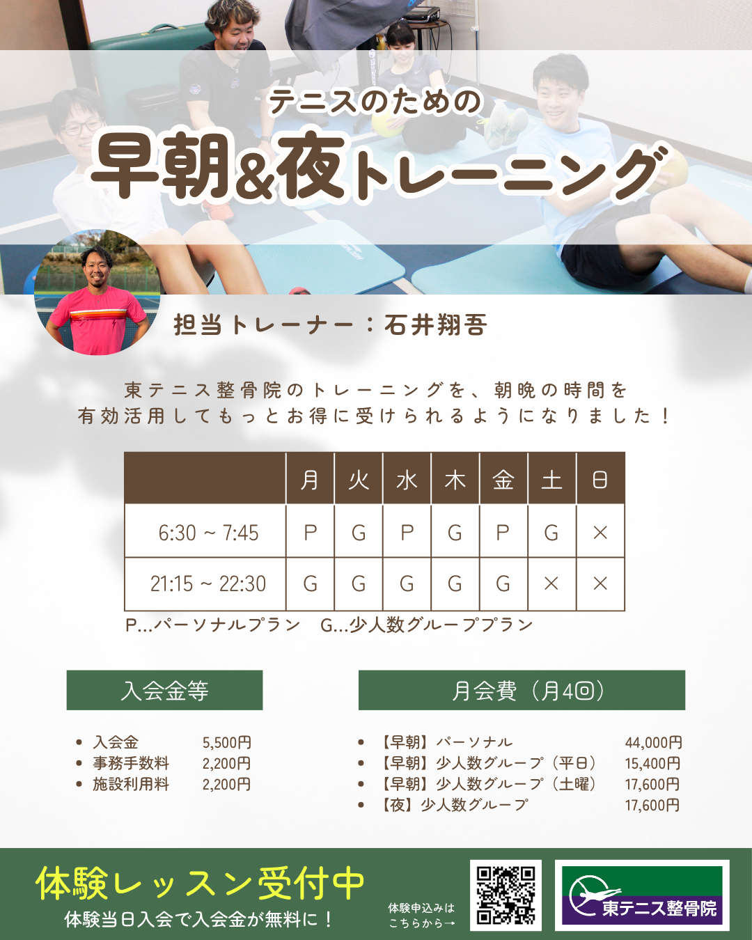 東テニス整骨院のトレーニングを、朝晩の時間を有効活用してもっとお得に受けられるようになりました!